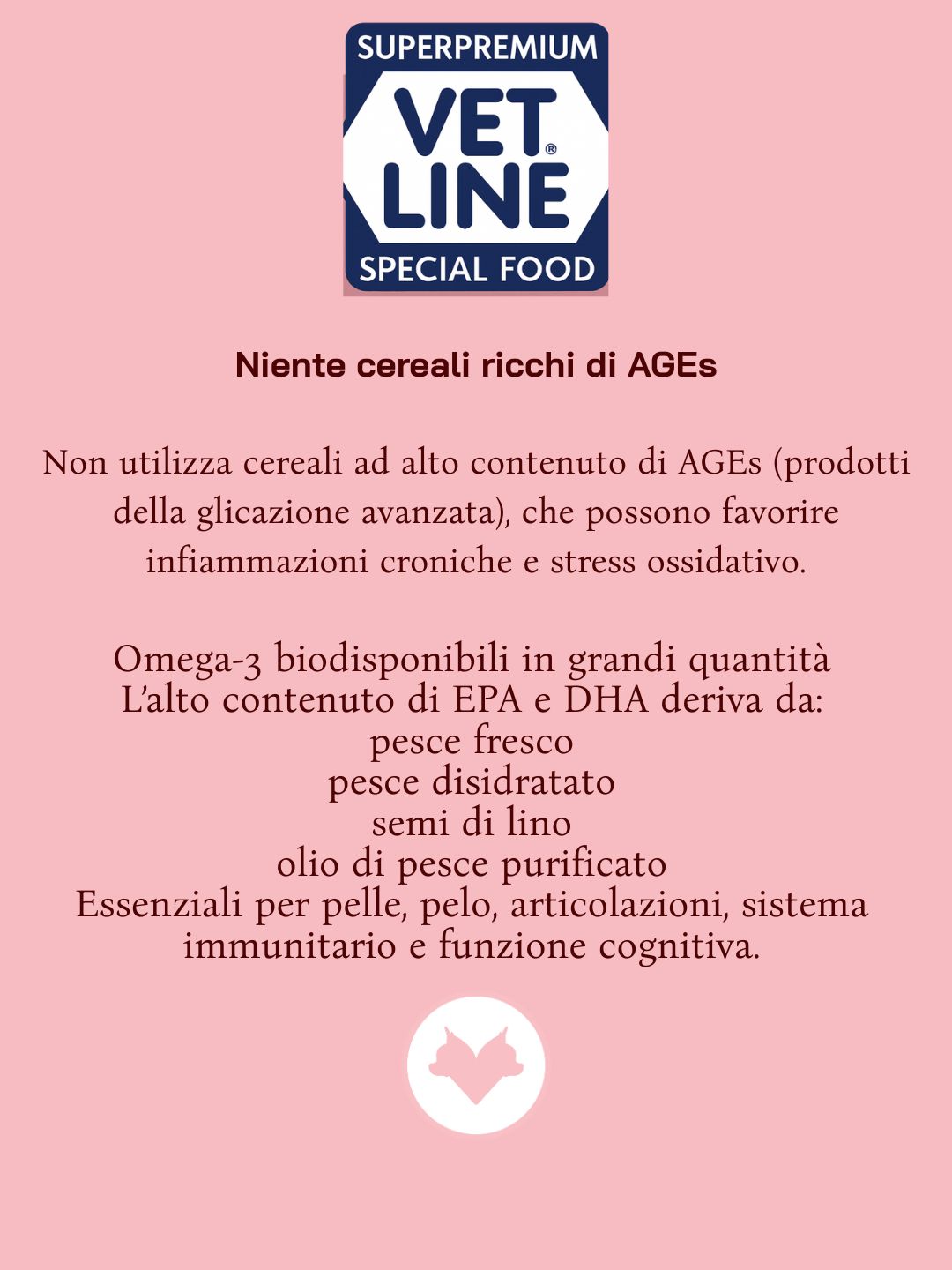Le ricette VetLine sono studiate per rispettare la fisiologia del cane, con ingredienti selezionati e formulazioni bilanciate, perfette per l’alimentazione di tutti i giorni.
